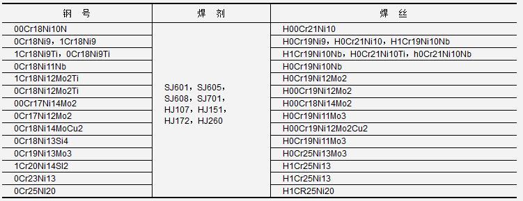 采用埋弧焊對不銹鋼進行焊接時,焊劑與匹配焊絲的匹配如下。
